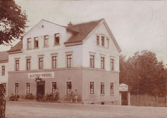 „Letzte Einkehr vor der Harth“ (Inhaber Max Julius Jahn) von 6 begeisterten Motorradfahrern und ihren Freundinnen.